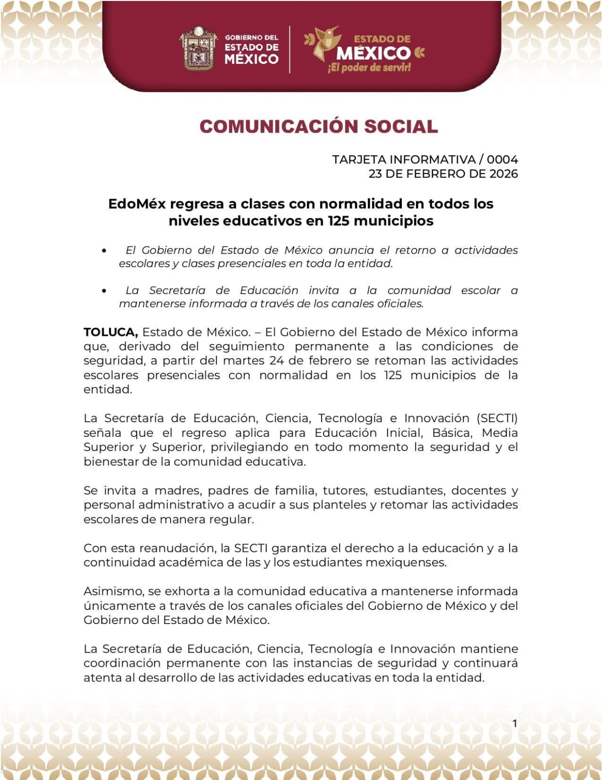 Se informa a la comunidad educativa del CETis 96, que de acuerdo al siguiente comunicado, las actividades presenciales se reanudan a partir se mañana 24 de febrero.